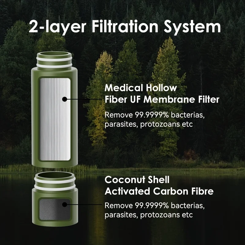 ️High Efficiency Advanced Filtering System: 1. High-performance Medical Grade Hollow Fiber UF Membrane, 2. High Quality Activated Carbon Fiber, 3. Coconut Shell Activated Carbon Rod, 4.Medical Grade PP Cotton. It's Portable Which Makes It The Perfect Solution Of Water Shortage In An Emergency, And Can Instantly Turn A Water Source Nearby Into Healthy Drinking Water. Must For Traveling, Backpacking, Camping And Emergency Kits!