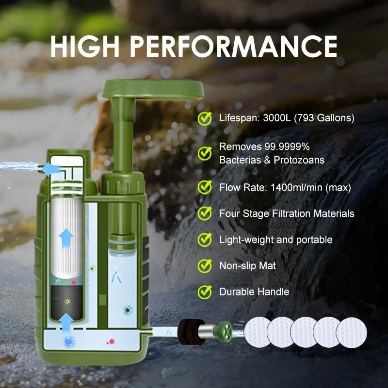 ️Ergonomic Design: Special Rubber On Sides And Bottom Of Pump Helps Maintain A Firm And Sturdy Surface While Pump Is In Use, As Well As Increasing Durability. The Shell Is Made Of Food-grade Materials. Upgrade Handle Diameter Up To 15mm, Never Break. The Transparent Lid Can Be Used As A Drinking Cup, A Top Compass Can Also Be Of Great Use When Traveling.comes With Detailed Instruction Manual, Tubing, Hose Clip, Advanced Filtering System, Carry Bag.